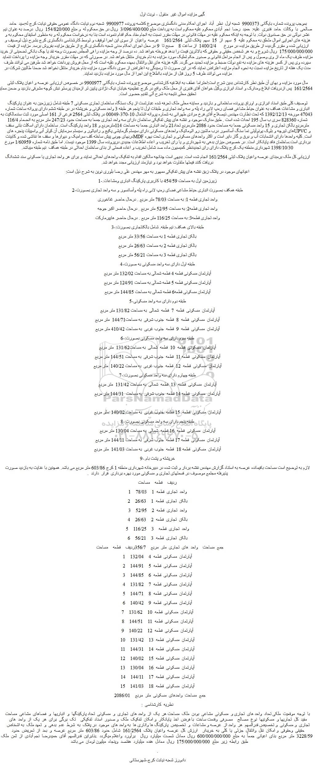 مزایده عمومی مزایده فروش 5 سهم از 15 سهم پلاک ثبتی 161/2564 عرصه واعیان برگزار میگردد. از کلیه افراد متخصص و شرکتهای واجد شرایط دعوت به عمل میآید تا در این مزایده با کد خبرگزاری پارس نماد : 3344956 شرکت نمایند تاریخ شروع مزایده : 1400/01/23 مهلت شرکت در مزایده: تا پایان روز 1400/02/04 مکان برگزاری اموال واگذاری استانهای البرز و دستهبندیهای مربوط به این حراجی املاک و زمین میباشد.