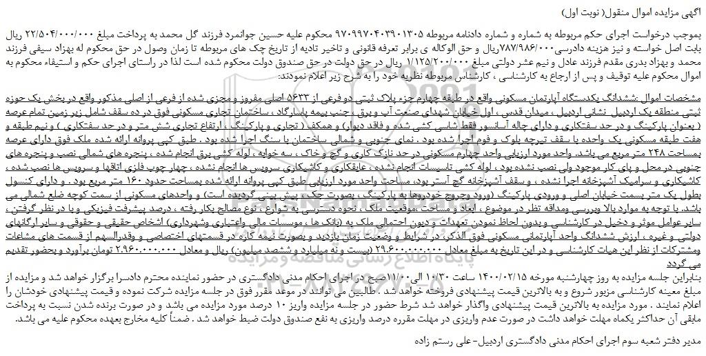شعبه صادر کننده:شعبه سوم اجرای احکام مدنی دادگستری شهرستان اردبیل