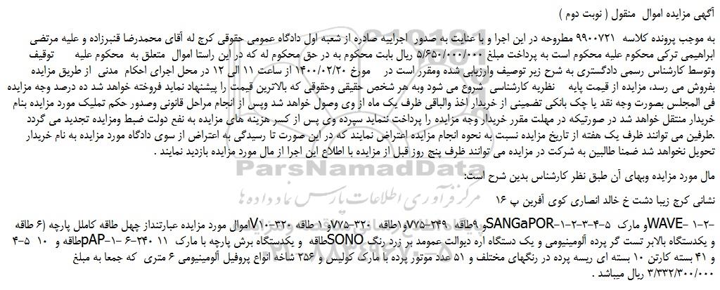 به موجب پرونده کلاسه 9900721 مطروحه در این اجرا و با عنایت به صدور اجراییه صادره از شعبه اول دادگاه عمومی حقوقی کرج له آقای محمدرضا قنبرزاده و علیه مرتضی ابراهیمی ترکی محکوم علیه محکوم است به پرداخت مبلغ 5/650/000/000 ریال بابت محکوم به در حق محکوم له که در این راستا اموال متعلق به محکوم علیه توقیف وتوسط کارشناس رسمی دادگستری به شرح زیر توصیف وارزیابی شده ومقرر است در مورخ 1400/02/20 از ساعت 11 الی 12 در محل اجرای احکام مدنی از طریق مزایده بفروش می رسد، مزایده از قیمت پایه نظریه کارشناسی شروع می شود وبه هر شخص حقیقی وحقوقی که بالاترین قیمت را پیشنهاد نماید فروخته خواهد شد ده درصد وجه مزایده فی المجلس بصورت وجه نقد یا چک بانکی تضمینی از خریدار اخذ والباقی ظرف یک ماه از وی وصول خواهد شد وپس از انجام مراحل قانونی وصدور حکم تملیک مورد مزایده بنام خریدار منتقل خواهد شد در صورتیکه در مهلت مقرر خریدار وجه مزایده را پرداخت ننماید سپرده وی پس از کسر هزینه های مزایده به نفع دولت ضبط ومزایده تجدید می گردد .طرفین می توانند ظرف یک هفته از تاریخ مزایده نسبت به نحوه انجام مزایده اعتراض نمایند که در این صورت تا رسیدگی به اعتراض از سوی دادگاه مورد مزایده به نام خریدار تحویل نخواهد شد ضمنا طالبین به شرکت در مزایده می توانند ظرف پنج روز قبل از مزایده با اطلاع این اجرا از مال مورد مزایده بازدید نمایند .