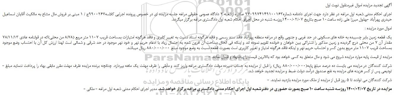 - مزایده در تاریخ 1400/02/07 روزسه شنبه ساعت 10 صبح بصورت حضوری در دفترشعبه اول اجرای احکام مدنی دادگستری مراغه برگزار خواهد شد. مدیر اجرای احکام مدنی شعبه اول مراغه - ملکی