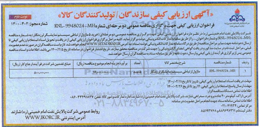 شرکت پالایش نفت امام خمینی (ره) شازند در نظر دارد فراخوان ارزیابی کیفی جهت برگزاری مناقصه عمومی دو مرحله ای (خرید 5 ماژول ارتباطی سیستم نمایشگر لرزه نگار) به شماره مناقصه (شماره RNL - 9948024 - MH) و شماره فراخوان ... را از طریق سامانه تدارکات الکترونیکی دولت برگزار نماید. کلیه مراحل برگزاری فراخوان ارزیابی کیفی از دریافت و تحویل اسناد استعلام ارزیابی کیفی تا ارسال دعوتنامه جهت سایر مراحل مناقصه از طریق درگاه سامانه تدارکات الکترونیکی دولت ستاد به آدرس ستاد ایران انجام خواهد شد. لازم است مناقصه گران در صورت عدم عضویت قبلی مراحل ثبت نام در سایت مذکور و دریافت گواهی امضای الکترونیکی را جهت شرکت در مناقصه محقق سازند. تاریخ انتشار فراخوان در سامانه تاریخ 1400.2.5 می باشد. اطلاعات و اسناد مناقصه عمومی پس از برگزاری فرآیند ارزیابی کیفی و ارسال دعوتنامه از طریق سامانه ستاد به مناقصه گران ارسال خواهد شد.