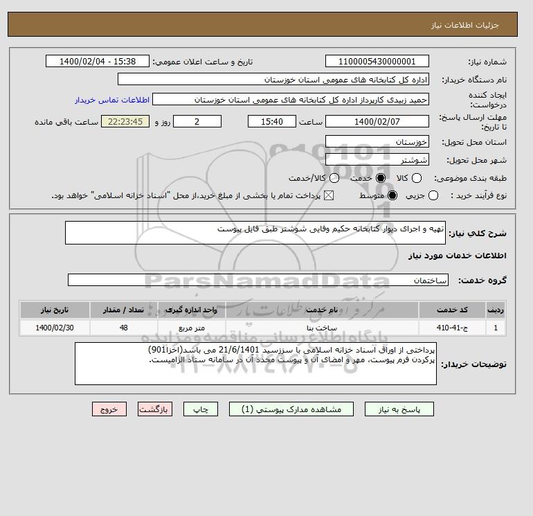 شرح کلی نیاز: تهیه و اجرای دیوار کتابخانه حکیم وفایی شوشتر طبق فایل پیوست