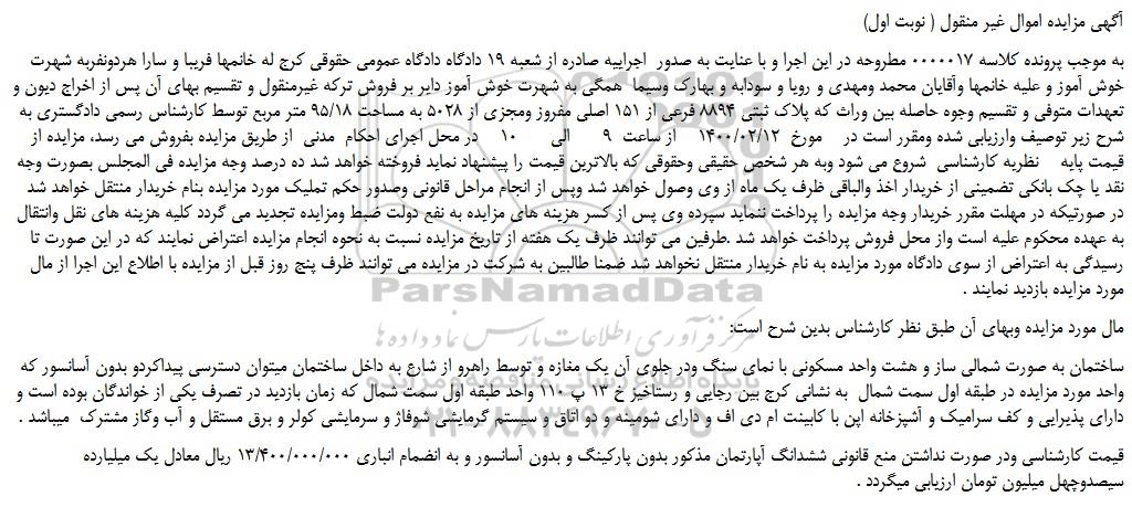 به موجب پرونده کلاسه 0000017 مطروحه در این اجرا و با عنایت به صدور اجراییه صادره از شعبه 19 دادگاه دادگاه عمومی حقوقی کرج له خانمها فریبا و سارا هردونفربه شهرت خوش آموز و علیه خانمها وآقایان محمد ومهدی و رویا و سودابه و بهارک وسیما همگی به شهرت خوش آموز دایر بر فروش ترکه غیرمنقول و تقسیم بهای آن پس از اخراج دیون و تعهدات متوفی و تقسیم وجوه حاصله بین وراث که پلاک ثبتی 8894 فرعی از 151 اصلی مفروز ومجزی از 5028 به مساحت 95/18 متر مربع توسط کارشناس رسمی دادگستری به شرح زیر توصیف وارزیابی شده ومقرر است در مورخ 1400/02/12 از ساعت 9 الی 10 در محل اجرای احکام مدنی از طریق مزایده بفروش می رسد، مزایده از قیمت پایه نظریه کارشناسی شروع می شود وبه هر شخص حقیقی وحقوقی که بالاترین قیمت را پیشنهاد نماید فروخته خواهد شد ده درصد وجه مزایده فی المجلس بصورت وجه نقد یا چک بانکی تضمینی از خریدار اخذ والباقی ظرف یک ماه از وی وصول خواهد شد وپس از انجام مراحل قانونی وصدور حکم تملیک مورد مزایده بنام خریدار منتقل خواهد شد در صورتیکه در مهلت مقرر خریدار وجه مزایده را پرداخت ننماید سپرده وی پس از کسر هزینه های مزایده به نفع دولت ضبط ومزایده تجدید می گردد کلیه هزینه های نقل وانتقال به عهده محکوم علیه است واز محل فروش پرداخت خواهد شد .طرفین می توانند ظرف یک هفته از تاریخ مزایده نسبت به نحوه انجام مزایده اعتراض نمایند که در این صورت تا رسیدگی به اعتراض از سوی دادگاه مورد مزایده به نام خریدار منتقل نخواهد شد ضمنا طالبین به شرکت در مزایده می توانند ظرف پنج روز قبل از مزایده با اطلاع این اجرا از مال مورد مزایده بازدید نمایند .
