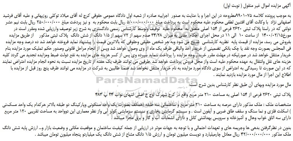 به موجب پرونده کلاسه 9901075مطروحه در این اجرا و با عنایت به صدور اجراییه صادره از شعبه اول دادگاه عمومی حقوقی کرج له آقای میلاد توکلی روزبهانی و علیه آقای فرشید اصفهانی نژاد با وکالت آقای افشین لطفی محکوم علیه محکوم است به پرداخت مبلغ 5/000/000/000 ریال بابت محکوم به و نیز پردخت مبلغ 250/000/000 ریال بابت نیم عشر دولتی که در راستا پلاک ثبتی 2620 فرعی از 154 اصلی متعلق به محکوم علیه توقیف وتوسط کارشناس رسمی دادگستری به شرح زیر توصیف وارزیابی شده ومقرر است در مورخ1400/02/15 از ساعت 10 الی 11 در محل اجرای احکام مدنی به میزان 34/28 صدم سهم از 72 سهم از 1/5 دانگ از شش دانگ پلاک ثبتی مذکور از طریق مزایده بفروش می رسد، مزایده از قیمت پایه نظریه کارشناسی شروع می شود وبه هر شخص حقیقی وحقوقی که بالاترین قیمت را پیشنهاد نماید فروخته خواهد شد ده درصد وجه مزایده فی المجلس بصورت وجه نقد یا چک بانکی تضمینی از خریدار اخذ والباقی ظرف یک ماه از وی وصول خواهد شد وپس از انجام مراحل قانونی وصدور حکم تملیک مورد مزایده بنام خریدار منتقل خواهد شد در صورتیکه در مهلت مقرر خریدار وجه مزایده را پرداخت ننماید سپرده وی پس از کسر هزینه های مزایده به نفع دولت ضبط ومزایده تجدید می گردد کلیه هزینه های نقل وانتقال به عهده محکوم علیه است واز محل فروش پرداخت خواهد شد .طرفین می توانند ظرف یک هفته از تاریخ مزایده نسبت به نحوه انجام مزایده اعتراض نمایند که در این صورت تا رسیدگی به اعتراض از سوی دادگاه مورد مزایده به نام خریدار منتقل نخواهد شد ضمنا طالبین به شرکت در مزایده می توانند ظرف پنج روز قبل از مزایده با اطلاع این اجرا از مال مورد مزایده بازدید نمایند .