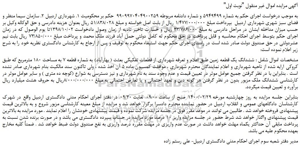 به موجب درخواست اجرای حکم به شماره 5949499 و شماره دادنامه مربوطه 9909970404900259 حکم بر محکومیت 1. شهرداری اردبیل 2. سازمان سیما منظر و فضای سبز شهری شهرداری اردبیل بپرداخت مبلغ 1/477/000/000 ریال از بابت اصل خواسته و مبلغ 51/838/028 ریال بعنوان هزینه دادرسی و حق الوکاله وکیل بر حسب میزان مداخله ایشان در مراحل دادرسی به مبلغ 33/786/000 ریال و خسارت تاخیر تادیه از زمان وصول دادخواست 1398/10/02تا یوم الوصول که در زمان اجرای حکم بتوسط اجرای احکام محاسبه و قابل پرداخت در حق محکوم له کامل دولتی حمل آباد فرزند ملک محمد و پرداخت مبلغ 73/850/000 ریال بابت نیم عشردولتی در حق صندوق دولت صادر شده است در راستای اجرای حکم جهت استیفاء محکوم به توقیف و پس از ارجاع به کارشناس دادگستری نظریه خود را به شرح زیر اعلام نموده است: