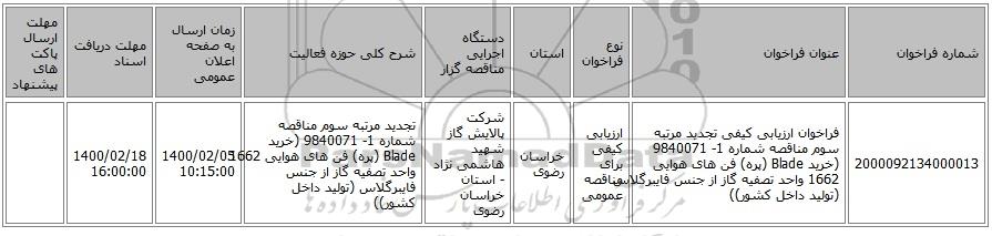 مناقصه، فراخوان ارزیابی کیفی تجدید مرتبه سوم مناقصه شماره 1- 9840071 (خرید Blade (پره) فن های هوایی 1662 واحد تصفیه گاز از جنس فایبرگلاس (تولید داخل کشور)) از کلیه افراد متخصص و شرکتها واجد شرایط دعوت به عمل میآید در مناقصه با کد خبرگزاری پارس نماد: 3355197 شرکت نمایند.