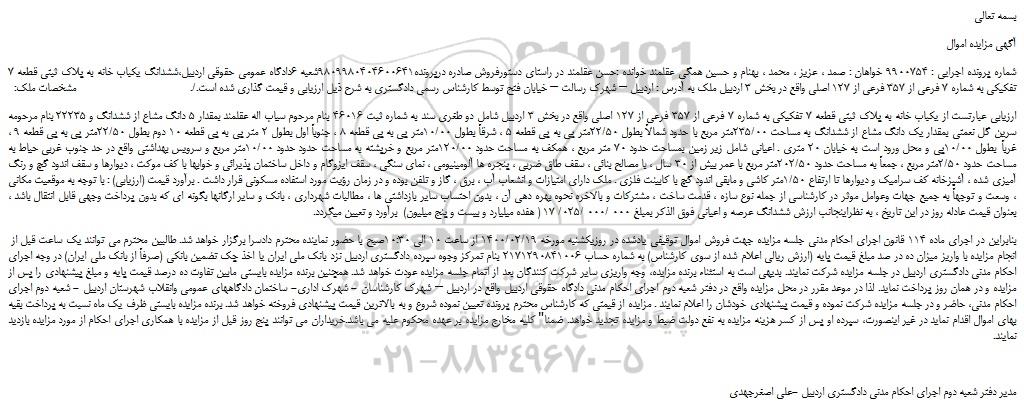 شماره پرونده اجرایی : 9900754 خواهان : صمد ، عزیز ، محمد ، بهنام و حسین همگی عقلمند خوانده :حسن عقلمند در راستای دستورفروش صادره درپرونده9809980404600641شعبه 6دادگاه عمومی حقوقی اردبیل،ششدانگ یکباب خانه به پلاک ثبتی قطعه 7 تفکیکی به شماره 7 فرعی از 357 فرعی از 127 اصلی واقع در بخش 3 اردبیل ملک به آدرس : اردبیل – شهرک رسالت – خیابان فتح توسط کارشناس رسمی دادگستری به شرح ذیل ارزیابی و قیمت گذاری شده است./. مشخصات ملک: