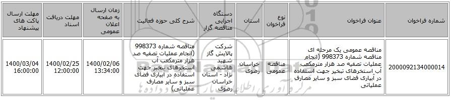 | 2000092134000014 | مناقصه عمومی یک مرحله ای مناقصه شماره 998373 (انجام عملیات تصفیه صد هزار مترمکعب آب استخرهای تبخیر جهت استفاده در آبیاری فضای سبز و سایر مصارف عملیاتی | مناقصه عمومی | خراسان رضوی | شرکت پالایش گاز شهید هاشمی نژاد - استان خراسان رضوی | مناقصه شماره 998373 (انجام عملیات تصفیه صد هزار مترمکعب آب استخرهای تبخیر جهت استفاده در آبیاری فضای سبز و سایر مصارف عملیاتی) | 1400/02/06 13:34:00 | 1400/02/25 12:00:00 | 1400/03/04 16:00:00 |