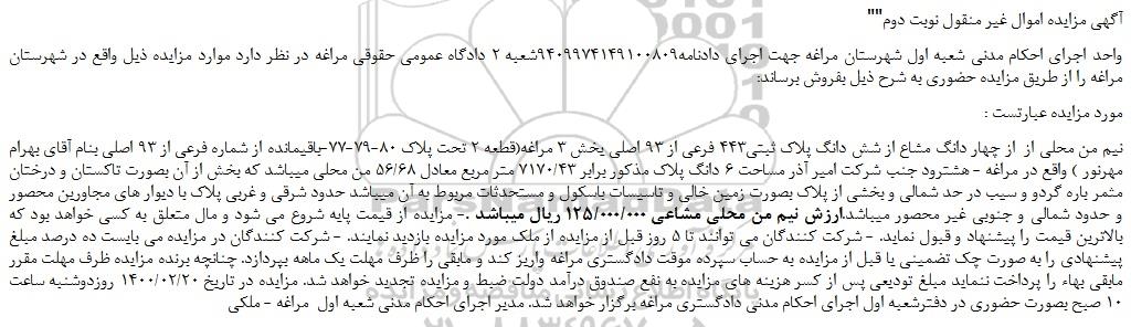 نیم من محلی از  از چهار دانگ مشاع از شش دانگ پلاک ثبتی443 فرعی از 93 اصلی یخش 3 مراغه(قطعه 2 تحت پلاک 80-79-77-باقیمانده از شماره فرعی از 93 اصلی بنام آقای بهرام مهرنور ) واقع در مراغه - هشترود جنب شرکت امیر آذر مساحت 6 دانگ پلاک مذکور برابر 7170/43 متر مربع معادل 56/68 من محلی میباشد که بخش از آن بصورت تاکستان و درختان مثمر باره گردو و سیب در حد شمالی و بخشی از پلاک بصورت زمین خالی و تاسیسات باسکول و مستحدثات مربوط به آن میباشد حدود شرقی و غربی پلاک با دیوار های مجاورین محصور و حدود شمالی و جنوبی غیر محصور میباشد.ارزش نیم من محلی مشاعی 125/000/000 ریال میباشد .- مزایده از قیمت پایه شروع می شود و مال متعلق به کسی خواهد بود که بالاترین قیمت را پیشنهاد و قبول نماید. - شرکت کنندگان می توانند تا 5 روز قبل از مزایده از ملک مورد مزایده بازدید نمایند. - شرکت کنندگان در مزایده می بایست ده درصد مبلغ پیشنهادی را به صورت چک تضمینی یا قبل از مزایده به حساب سپرده موقت دادگستری مراغه واریز کند و مابقی را ظرف مهلت یک ماهه بپردازد. چنانچه برنده مزایده ظرف مهلت مقرر مابقی بهاء را پرداخت ننماید مبلغ تودیعی پس از کسر هزینه های مزایده به نفع صندوق درآمد دولت ضبط و مزایده تجدید خواهد شد. مزایده در تاریخ 1400/02/20 روزدوشنبه ساعت 10 صبح بصورت حضوری در دفترشعبه اول اجرای احکام مدنی دادگستری مراغه برگزار خواهد شد. مدیر اجرای احکام مدنی شعبه اول  مراغه - ملکی