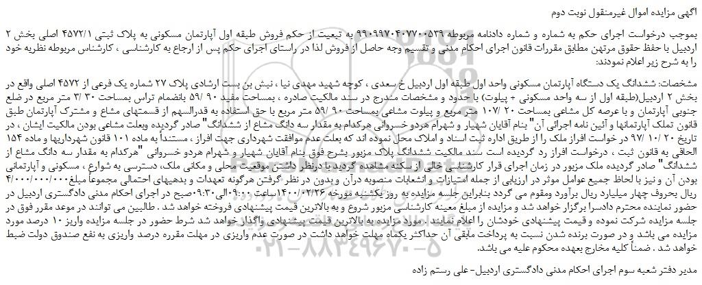 مشخصات: ششدانگ یک دستگاه آپارتمان مسکونی واحد اول طبقه اول اردبیل خ سعدی ، کوچه شهید مهدی نیا ، نبش بن بست ارشادی پلاک 27 شماره یک فرعی از 4572 اصلی واقع در بخش 2 اردبیل(طبقه اول از سه واحد مسکونی + پیلوت) با حدود و مشخصات مندرج در سند مالکیت صادره ، بمساحت مفید 90 /59 بانضمام تراس بمساحت 30 /3 متر مربع در ضلع جنوبی آپارتمان و با عرصه کل مشاعی بمساحت 20 /107 متر مربع و پیلوت مشاعی بمساحت 90 /59 متر مربع با حق استفاده به قدرالسهم از قسمتهای مشاع و مشترک آپارتمان طبق قانون تملک آپارتمانها و آئین نامه اجرائی آن" بنام آقایان شهیار و شهرام هردو خسروانی هرکدام به مقدار سه دانگ مشاع از ششدانگ" صادر گردیده وبعلت مشاعی بودن مالکیت ایشان ، در تاریخ 20 /10 /97 در خواست افراز ملک را از طریق اداره ثبت اسناد و املاک محل نموده اند که بعلت عدم موافقت شهرداری جهت افراز ، مستنداً به ماده 101 قانون شهرداریها و ماده 154 الحاقی به قانون ثبت ، درخواست افراز رد گردیده است سند مالکیت ششدانگ پلاک مزبور بشرح فوق بنام آقایان شهیار و شهرام هردو خسروانی "هرکدام به مقدار سه دانگ مشاع از ششدانگ" صادر گردیده ملک مزبور در زمان اجرای قرار کارشناسی خالی از سکنه مشاهده گردید با درنظر داشتن موقعیت محلی و مکانی ملک، دسترسی به شوارع ، مسکونی و آپارتمانی بودن آن و نیز با لحاظ جمیع عوامل موثر در ارزیابی از جمله امتیازات و انشعابات منصوبه درآن و بدون در نظر گرفتن هرگونه تعهدات و بدهیهای احتمالی مجموعاً مبلغ4/000/000/000 ریال بحروف چهار میلیارد ریال برآورد ومقوم می گردد بنابراین جلسه مزایده به روز یکشنبه مورخه 1400/02/26ساعت 09:00الی09:30صبح در اجرای احکام مدنی دادگستری اردبیل در حضور نماینده محترم دادسرا برگزار خواهد شد و مزایده از مبلغ معینه کارشناسی مزبور شروع و به بالاترین قیمت پیشنهادی فروخته خواهد شد . طالبین می توانند در موعد مقرر فوق در جلسه مزایده شرکت نموده و قیمت پیشنهادی خودشان را اعلام نمایند . مورد مزایده به بالاترین قیمت پیشنهادی واگذار خواهد شد شرط حضور در جلسه مزایده واریز 10 درصد مورد مزایده می باشد و در صورت برنده شدن نسبت به پرداخت مابقی آن حداکثر یکماه مهلت خواهد داشت در صورت عدم واریزی در مهلت مقرره درصد واریزی به نفع صندوق دولت ضبط خواهد شد . ضمناً کلیه مخارج بعهده محکوم علیه می باشد.