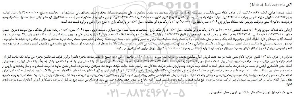 شماره پرونده اجرایی: کلاسه 9901867شعبه اول اجرای احکام مدنی دادگستری شهرستان اردبیل در راستای پرونده مطروحه مابین، محکوم له: علی محمدپورفرزندزایل محکوم علیهم :رضاقهرمانی وداودشهبازی  محکومند به مبلغ750/000/000ریال اصل خواسته ومبلغ26/097/876ریال هزینه دادرسی ومبلغ13/360/000ریال ازبابت هزینه واخواست  وخسارت تاخیر تادیه از تاریخ تقدیم دادخواست تاریخ1399/07/01 لغایت اجرای حکم درحق محکوم له،ومبلغ37/500/000ریال نیم عشر دولتی درحق صندوق دولت،باتوجه به درخواست محکوم له مبنی برتوقیف وفروش یک دستگاه سواری پژو 206 به شماره انتظامی 91 – 491 ب 22 به رنگ نقره ای متالیک ، مدل 1383 در پارکینگ زارع  به شرح زیر ارزیابی و برآورد قیمت شده است؛