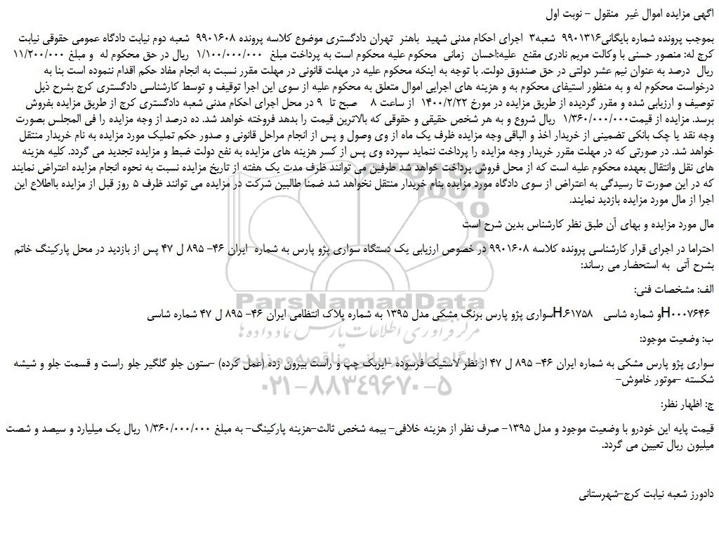 احتراما در اجرای قرار کارشناسی پرونده کلاسه 9901608 در خصوص ارزیابی یک دستگاه سواری پژو پارس به شماره ایران 46- 895 ل 47 پس از بازدید در محل پارکینگ خاتم بشرح آتی به استحضار می رساند: