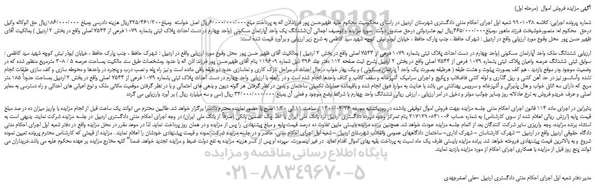 شماره پرونده اجرایی: کلاسه 9901038 شعبه اول اجرای احکام مدنی دادگستری شهرستان اردبیل در راستای محکومیت محکوم علیه ظهیرحسن پور فرزنداذن اله به پرداخت مبلغ6/000/000/000ریال اصل خواسته ومبلغ325/461/200ریال هزینه دادرسی ومبلغ 186/000/000ریال حق الوکاله وکیل درحق محکوم له: منصورخوشبخت فرزند ماهور ،ومبلغ465/000/000ریال نیم عشردولتی درحق صندوق دولت ،مورد مزایده و توصیف اجمالی آن:ششدانگ یک واحد آپارتمان مسکونی (واحد چهارم در دست احداث پلاک ثبتی بشماره 1079 فرعی از 7544 اصلی واقع در بخش 2 اردبیل ) بمالکیت آقای ظهیر حسن پور محل وقوع مورد ارزیابی واقع در اردبیل : شهرک حافظ ، جنب پارک حافظ ، خیابان ابوذر نبش کوچه شهید سید کاظمی به شرح زیر ارزیابی و برآورد قیمت شده است؛