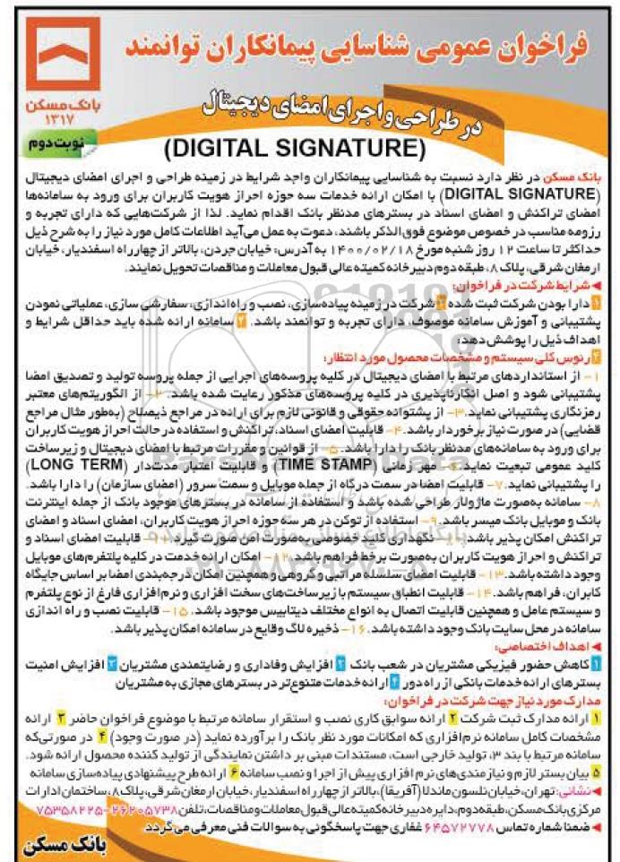 بانک مسکن در نظر دارد نسبت به شناسایی یمانکاران واجد شرایط در زمینه طراحی و اجرای امضای دیجیتال digital signature با امکان ارائه خدمت به حوزه احراز هویت کاربران برای ورود به سامانه ها، امضای تراکنش، و امضای اسناد در بسترهای مدنظر بانک اقدام نماید. لذا از شرکتهایی که دارای تجربه و رزومه مناسب در خصوص موضوع فوق الذکر باشند دعوت به عمل می آید اطلاعات کامل مورد نیاز را به شرح ذیل حداکثر تا ساعت 12 روز شنبه مورخ 400.2.18 به آدرس خیابان جردن بالاتر از چهارراه اسفندیار- خ ارمغان شرقی- پ 8 طبقه دوم دبیرخانه کمیته عالی قبول ملاحظات و مناقصات تحویل نمایند.