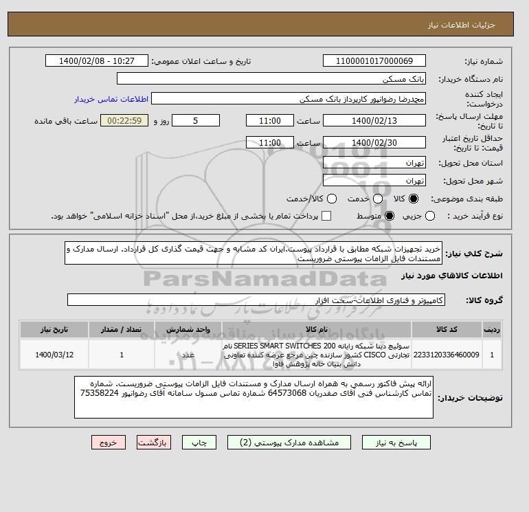 استعلام بها و موضوع استعلام استعلام خرید تجهیزات شبکه مطابق با قرارداد پیوست.ایران کد مشابه و جهت قیمت گذاری کل قرارداد. ارسال مدارک و مستندات فایل الزامات پیوستی ضروریست به اطلاع کلیه شرکت‌ها و افراد متخصص واجد شرایط می‌رساند، آگهی گذار در نظر دارد از طریق استعلام بها، نسبت به انتخاب و دریافت پیشنهادات اقدام نماید. این استعلام با کد آگهی ثبت شده در سامانه خبرگزاری پارس نماد : 3363745 منتشر شده است. مشخصات استعلام : تاریخ شروع استعلام: 1400/02/08 آخرین مهلت ارسال پیشنهاد قیمت : 1400/02/13 و محل اجرای پروژه : استان تهران میباشد. استعلام قیمت مورد درخواست : استعلام خرید تجهیزات شبکه مطابق با قرارداد پیوست.ایران کد مشابه و جهت قیمت گذاری کل قرارداد. ارسال مدارک و مستندات فایل الزامات پیوستی ضروریست با دسته‌بندی‌های تخصصی و گروه های مرتبط : کامپیوتر, اینترنت شبکه, استعلام اطلاع رسانی میگردد. شرایط شرکت در استعلام آنلاین : ابتدا ثبت نام در سامانه استعلام پارس نماد و تکمیل مدارک موردنیاز و بارگذاری در سامانه رعایت تمامی ضوابط و الزامات مندرج در اسناد استعلام است.