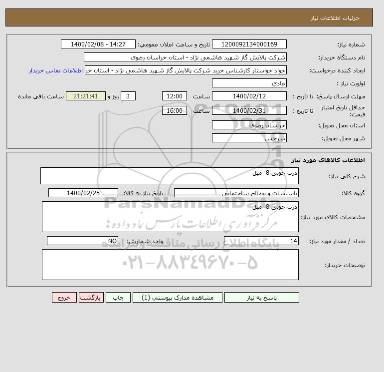 نام دستگاه خریدار:شرکت پالایش گاز شهید هاشمی نژاد - استان خراسان رضوی