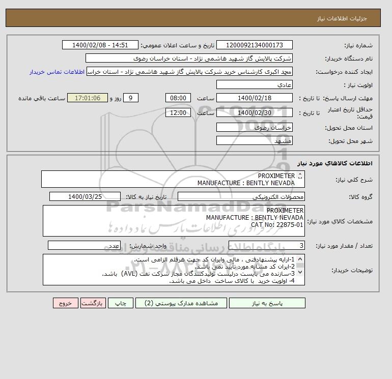 نام دستگاه خریدار:شرکت پالایش گاز شهید هاشمی نژاد - استان خراسان رضوی