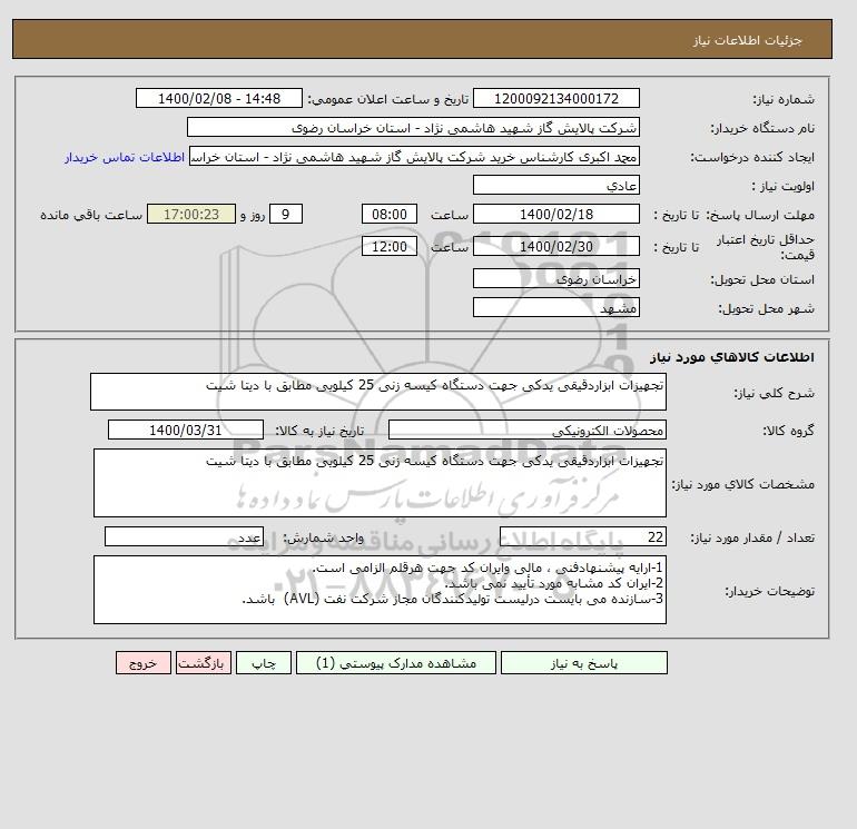 نام دستگاه خریدار:شرکت پالایش گاز شهید هاشمی نژاد - استان خراسان رضوی