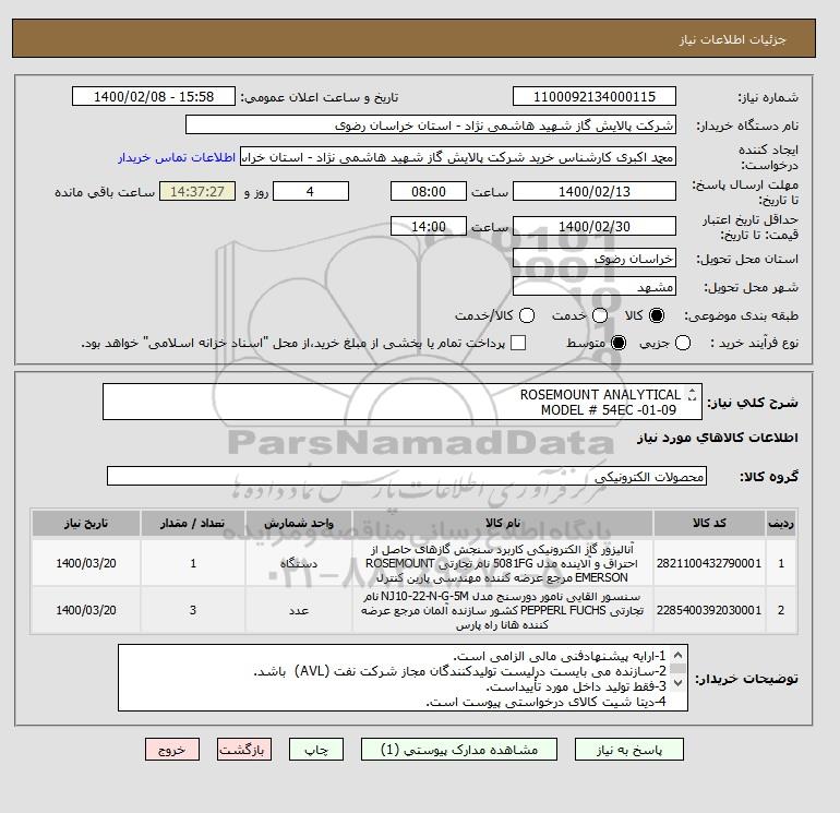 نام دستگاه خریدار:شرکت پالایش گاز شهید هاشمی نژاد - استان خراسان رضوی