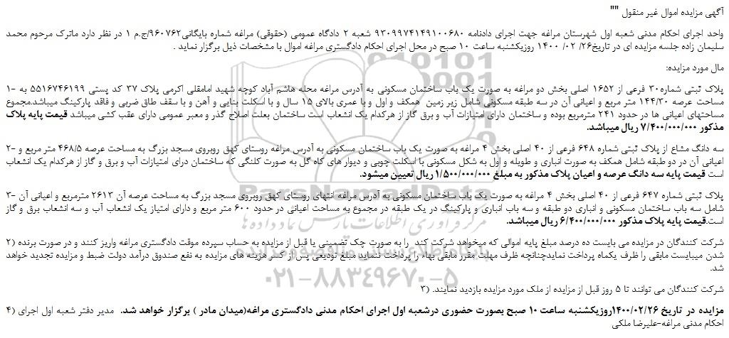 واحد اجرای احکام مدنی شعبه اول شهرستان مراغه جهت اجرای دادنامه 9309974149100680 شعبه 2 دادگاه عمومی (حقوقی) مراغه شماره بایگانی960762/ج.م 1 در نظر دارد ماترک مرحوم محمد سلیمان زاده جلسه مزایده ای در تاریخ26/ 02/ 1400 روزیکشنبه ساعت 10 صبح در محل اجرای احکام دادگستری مراغه اموال با مشخصات ذیل برگزار نماید .