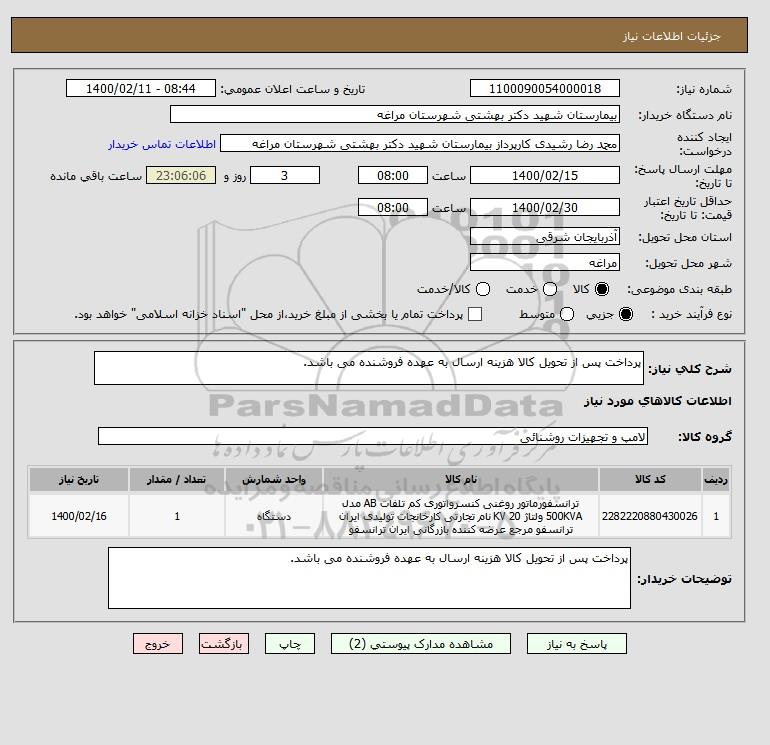 شرح کلی نیاز: پرداخت پس از تحویل کالا هزینه ارسال به عهده فروشنده می باشد.
