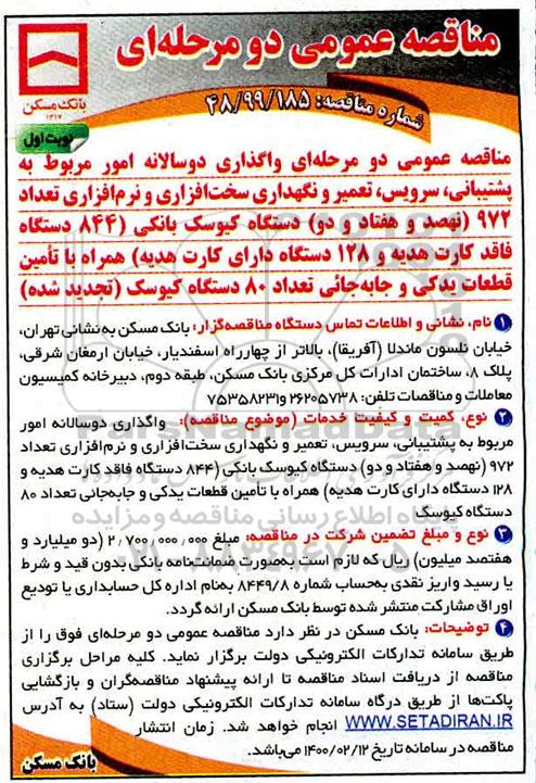 مناقصه عمومی دومرحله ای واگذاری دوسالانه امور مربوط به پشتیبانی، سرویس، تعمیر و نگهداری سخت افزاری و نرم افزاری تعداد 972 (نهصد و هفتاد و دو) دستگاه کیوسک بانکی (844 دستگاه فاقد کارت هدیه و 128 دستگاه دارای کارت هدیه) همراه با تامین قطعات یدکی و جابه جائی تعداد 80 دستگاه کیوسک (تجدید شده)