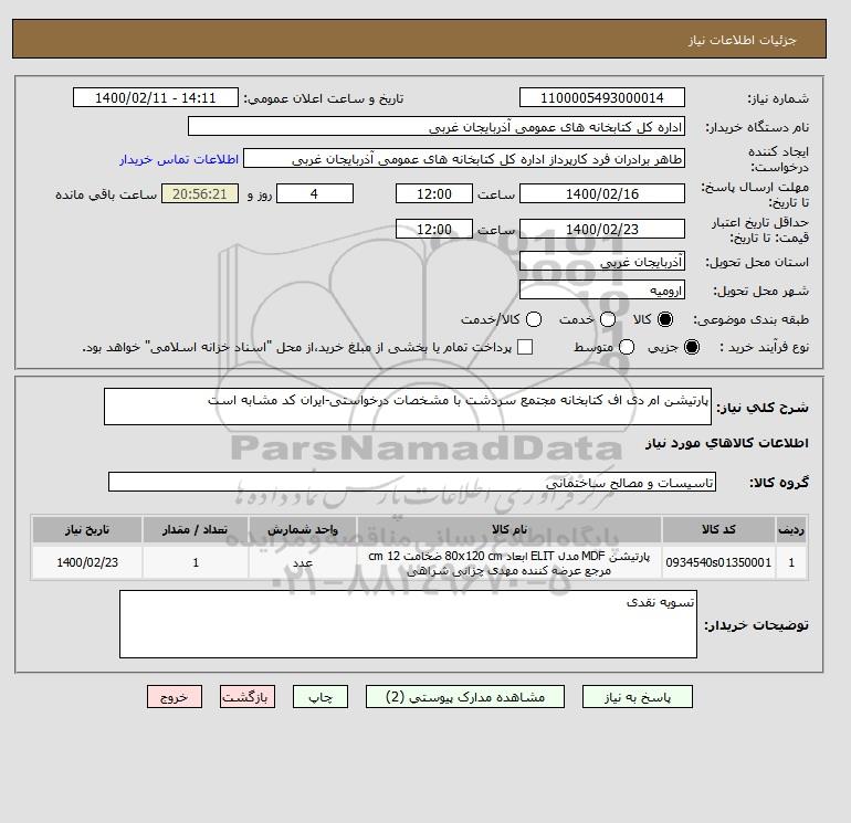 شرح کلی نیاز: پارتیشن ام دی اف کتابخانه مجتمع سردشت با مشخصات درخواستی-ایران کد مشابه است