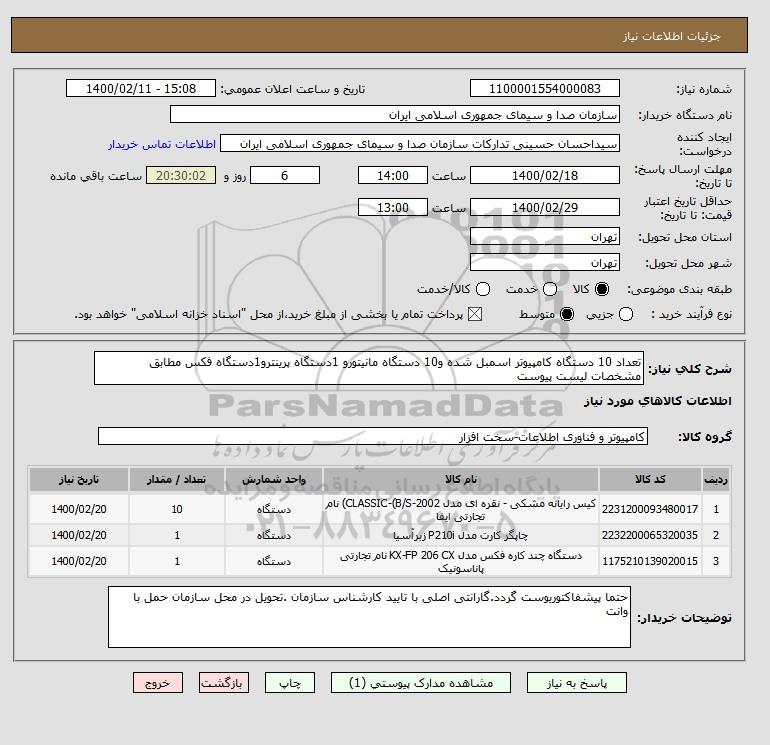 شرح کلی نیاز: تعداد 10 دستگاه کامپیوتر اسمبل شده و10 دستگاه مانیتورو 1دستگاه پرینترو1دستگاه فکس مطابق مشخصات لیست پیوست