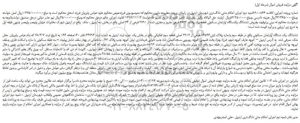 شماره پرونده اجرایی: کلاسه 9900866شعبه دوم اجرای احکام مدنی دادگستری شهرستان اردبیل در راستای پرونده مطروحه مابین، محکوم له: سعیدموسوی فرزندعوض محکوم علیه :عباس یاوریان فرزند اسحق محکوم است به مبلغ1/375/000/000ریال اصل خواسته ومبلغ43/465/000ریال هزینه دادرسی ومبلغ53/250/000ریال ازبابت حق الوکاله وکیل وخسارت تاخیر تادیه از تاریخ تقدیم دادخواست 1397/11/02 لغایت اجرای حکم درحق محکوم له،ومبلغ35/000/000ریال نیم عشر دولتی درحق صندوق دولت،باتوجه به درخواست محکوم له مبنی برتوقیف وفروش ششدانگ یکدستگاه اپارتمان مسکونی قطعه یک پلاک 3632 فرعی مفروز و مجزی شده از 2791 فرعی از 34 اصلی واقع در بخش سه اردبیل ، ملک  واقع در اردبیل شهرک مخابرات خیابان ولیعصر ولیعصر جنوبی طبقه اول به شرح زیر ارزیابی و برآورد قیمت شده است؛