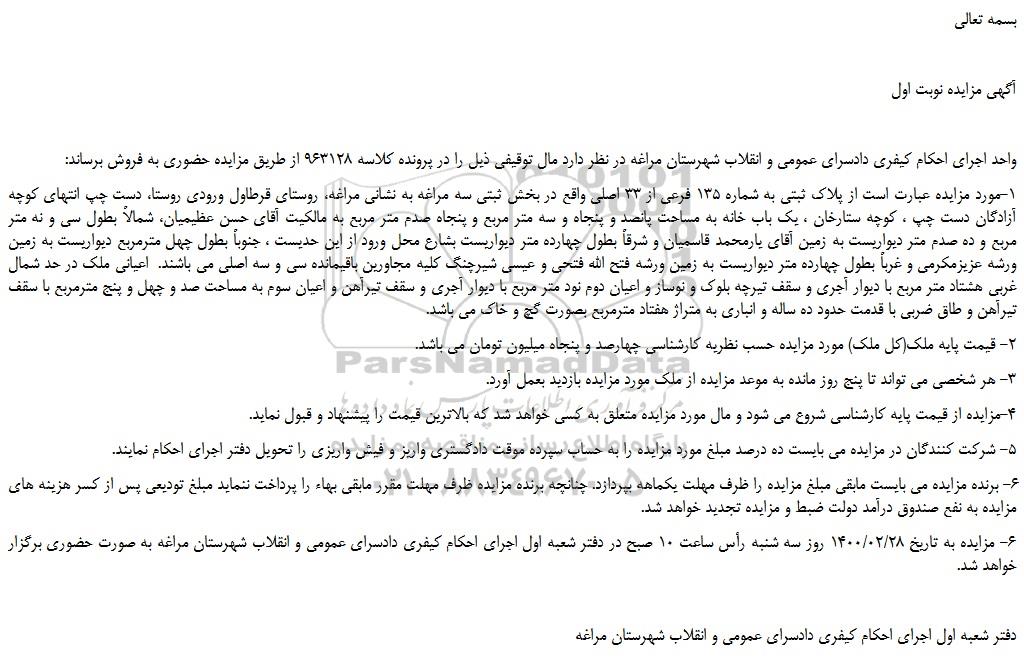 6- مزایده به تاریخ 1400/02/28 روز سه شنبه رأس ساعت 10 صبح در دفتر شعبه اول اجرای احکام کیفری دادسرای عمومی و انقلاب شهرستان مراغه به صورت حضوری برگزار خواهد شد.