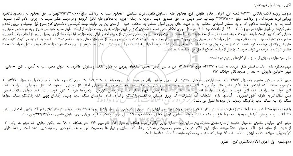 بموجب پرونده کلاسه بایگانی  982431 شعبه  اول  اجرای  احکام  حقوقی  کرج  محکوم  علیه  : سیاوش طاهری فرزند عبدالعلی ،  محکوم  است  به  پرداخت  مبلغ 2/939/340/000تومان در  حق  محکوم  له  : محمود نیکخواه بهرامی فرزند نصرت اله ، و  پرداخت  مبلغ  146/967/000 بابت نیم عشر  دولتی  در  حق  صندوق  دولت  . توجه به  اینکه  اجراییه  به محکوم علیه ابلاغ  گردیده  و در مهلت  مقرر  نسبت به  اجرای  حکم  اقدام  ننموده  است  بنا  به  درخواست  محکوم  له  و  به  منظور  استیفای  محکوم  به  و  هزینه  های اجرایی اموال  متعلق  به  محکوم  علیه    از سوی این اجرا توقیف توسط کارشناسی دادگستری کرج بشرح ذیل توصیف و ارزیابی شده و مقرر گردیده از طریق مزایده در مورخ 21-2-1400  از ساعت8صبح تا  9  در محل اجرای احکام مدنی شعبه دادگستری کرج از طریق مزایده بفروش برسد. مزایده از قیمت  طبق نظریه کارشناس شروع و به هر شخص حقیقی و حقوقی که بالاترین قیمت را بدهد فروخته خواهد شد. ده درصد از وجه مزایده را فی المجلس بصورت وجه نقد یا چک بانکی تضمینی از خریدار اخذ و الباقی وجه مزایده ظرف یک ماه از وی وصول و پس از انجام مراحل قانونی و صدور حکم تملیک مورد مزایده به نام خریدار منتقل خواهد شد. در صورتی که در مهلت مقرر خریدار وجه مزایده را پرداخت ننماید سپرده وی پس از کسر هزینه های مزایده به نفع دولت ضبط و مزایده تجدید می گردد. کلیه هزینه های نقل وانتقال بعهده محکوم علیه است که از محل فروش پرداخت خواهد شد طرفین    می توانند مزایده اعتراض نمایند که در این صورت تا رسیدگی به اعتراض از سوی دادگاه مورد مزایده بنام خریدار منتقل نخواهد شد ضمنا طالبین شرکت در مزایده می توانند ظرف 5 روز قبل از مزایده بااطلاع از مال مورد مزایده بازدید نمایند.