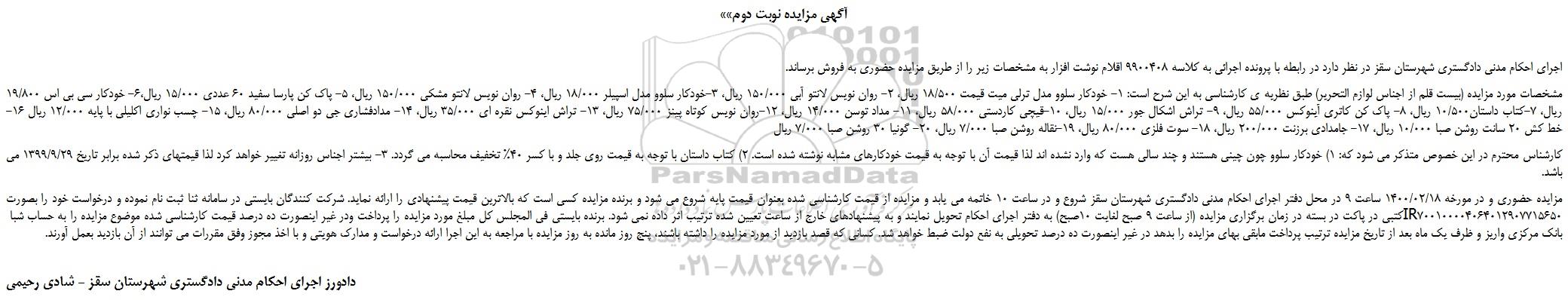 اجرای احکام مدنی دادگستری شهرستان سقز در نظر دارد در رابطه با پرونده اجرائی به کلاسه 9900408 اقلام نوشت افزار به مشخصات زیر را از طریق مزایده حضوری به فروش برساند.