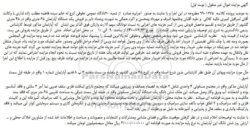 به موجب پرونده کلاسه 9901275 مطروحه در این اجرا و با عنایت به صدور اجراییه صادره از شعبه 20دادگاه عمومی حقوقی کرج له خانم سیده فاطمه مطلب زاده لداری با وکالت آقای اسرافیل امیری عالیه کلائی و علیه آقایان وخانمها اشرف و مهرداد ومحسن و اکرم همگی به شهرت پیشداد دایر بر فروش یک دستگاه آپارتمان 65 متری واقع در 45 متری گلشهر از طریق مزایده و تقسیم ماحصل فروش پس از کسر هزینه های اجرایی به نسبت دودانگ سهم الارث وارثان فوق الذکر بین ایشان که آپارتمان مذکور توسط کارشناس رسمی دادگستری به شرح زیر توصیف وارزیابی شده ومقرر است در مورخ 1400/02/22 از ساعت 9 الی 10 در محل اجرای احکام مدنی از طریق مزایده بفروش می رسد، مزایده از قیمت پایه نظریه کارشناسی شروع می شود وبه هر شخص حقیقی وحقوقی که بالاترین قیمت را پیشنهاد نماید فروخته خواهد شد ده درصد وجه مزایده فی المجلس بصورت وجه نقد یا چک بانکی تضمینی از خریدار اخذ والباقی ظرف یک ماه از وی وصول خواهد شد وپس از انجام مراحل قانونی وصدور حکم تملیک مورد مزایده بنام خریدار منتقل خواهد شد در صورتیکه در مهلت مقرر خریدار وجه مزایده را پرداخت ننماید سپرده وی پس از کسر هزینه های مزایده به نفع دولت ضبط ومزایده تجدید می گردد کلیه هزینه های نقل وانتقال به عهده محکوم علیه است واز محل فروش پرداخت خواهد شد .طرفین می توانند ظرف یک هفته از تاریخ مزایده نسبت به نحوه انجام مزایده اعتراض نمایند که در این صورت تا رسیدگی به اعتراض از سوی دادگاه مورد مزایده به نام خریدار منتقل نخواهد شد ضمنا طالبین به شرکت در مزایده می توانند ظرف پنج روز قبل از مزایده با اطلاع این اجرا از مال مورد مزایده بازدید نمایند .