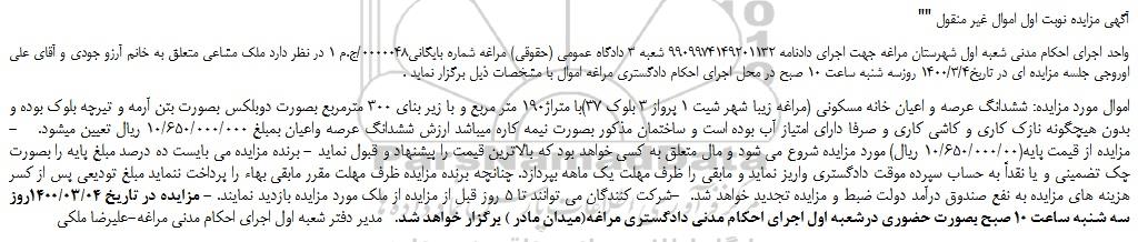 "آگهی مزایده نوبت اول اموال غیر منقول "
