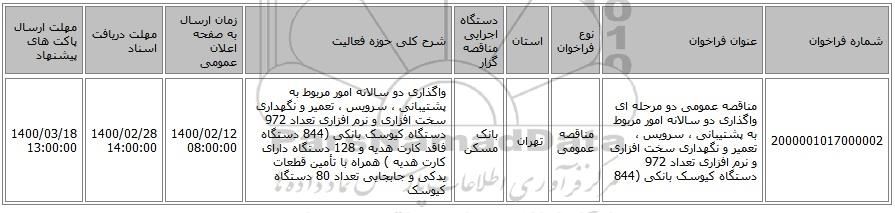 2000001017000002مناقصه عمومی دو مرحله ای واگذاری دو سالانه امور مربوط به پشتیبانی ، سرویس ، تعمیر و نگهداری سخت افزاری و نرم افزاری تعداد 972 دستگاه کیوسک بانکی (844 مناقصه عمومیتهرانبانک مسکنواگذاری دو سالانه امور مربوط به پشتیبانی ، سرویس ، تعمیر و نگهداری سخت افزاری و نرم افزاری تعداد 972 دستگاه کیوسک بانکی (844 دستگاه فاقد کارت هدیه و 128 دستگاه دارای کارت هدیه ) همراه با تأمین قطعات یدکی و جابجایی تعداد 80 دستگاه کیوسک 1400/02/12 08:00:001400/02/28 14:00:001400/03/18 13:00:00