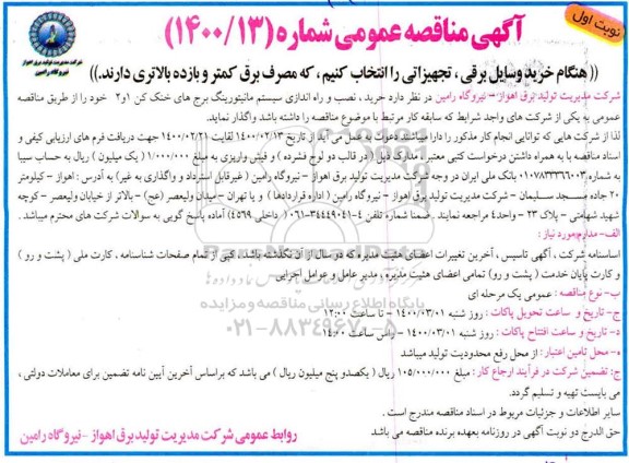 شرکت مدیریت تولید برق اهواز ـ نیروگاه رامین در نظر دارد خرید، نصب و راه اندازی سیستم مانیتورینگ برج های خنک کن فاز 1 و 2 خود را از طریق مناقصه عمومی به یکی از شرکت های واجد شرایط که سابقه کار مرتبط با موضوع مناقصه را داشته باشد واگذار نماید.