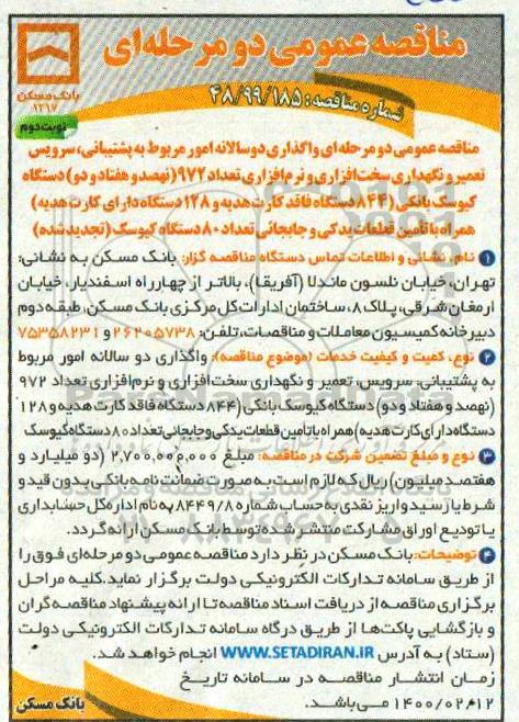 مناقصه عمومی دومرحله ای واگذاری دوسالانه امور مربوط به پشتیبانی، سرویس، تعمیر و نگهداری سخت افزاری و نرم افزاری تعداد 972 (نهصد و هفتاد و دو) دستگاه کیوسک بانکی (844 دستگاه فاقد کارت هدیه و 128 دستگاه دارای کارت هدیه) همراه با تامین قطعات یدکی و جابه جائی تعداد 80 دستگاه کیوسک (تجدید شده)