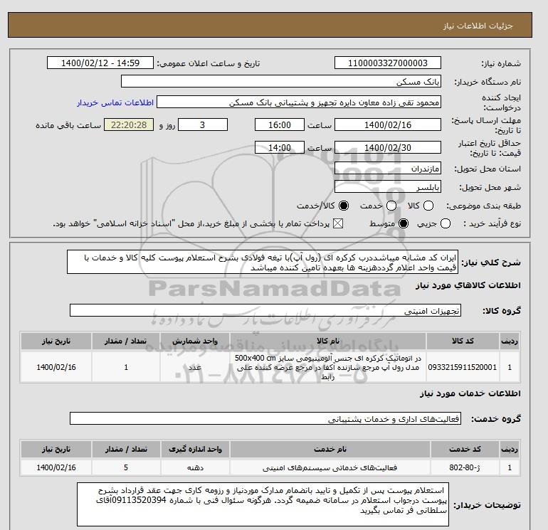 شرح کلی نیاز: ایران کد مشابه میباشددرب کرکره ای (رول آپ)با تیغه فولادی بشرح استعلام پیوست کلیه کالا و خدمات با قیمت واحد اعلام گرددهزینه ها بعهده تامین کننده میباشد