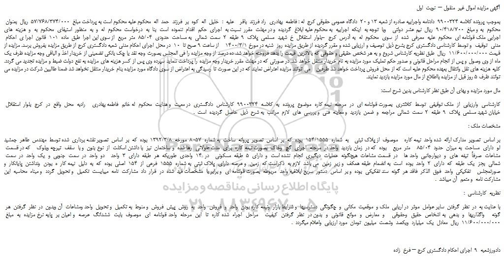 بموجب پرونده کلاسه 9900324 دادنامه واجراییه صادره از شعبه 13 و 20 دادگاه عمومی حقوقی کرج له : فاطمه بهادری راد فرزند باقر علیه : خلیل اله کوه بر فرزند حمد اله محکوم علیه محکوم است به پرداخت مبلغ 57/768/374/000 ریال بعنوان محکوم به و مبلغ 90/418/700 ریال نیم عشر دولتی وبا توجه به اینکه اجراییه به محکوم علیه ابلاغ گردیده و در مهلت مقرر نسبت به اجرای حکم اقدام ننموده است بنا به درخواست محکوم له و به منظور استیفای محکوم به و هزینه های اجرایی ملک قولنامه ای محکوم علیه معرفی شده از سوی محکوم له به آدرس کرج -بلوار استقلال خ شهید مسلمی پلاک 9 طبقه 2 سمت شمالی به مساحت حدودی 85/04 متر مربع از سوی این اجرا طبق ماده 101 قانون اجرا ی احکام مدنی توقیف و توسط کارشناسی دادگستری کرج بشرح ذیل توصیف و ارزیابی شده و مقرر گردیده از طریق مزایده روز شنبه در مورخ 1400/3/1 از ساعت 9 صبح تا 10 در محل اجرای احکام مدنی شعبه دادگستری کرج از طریق مزایده بفروش برسد. مزایده از قیمت 11/600/000/000 ریال طبق نظریه کارشناس شروع و به هر شخص حقیقی و حقوقی که بالاترین قیمت را بدهد فروخته خواهد شد. ده درصد از وجه مزایده را فی المجلس بصورت وجه نقد یا چک بانکی تضمینی از خریدار اخذ و الباقی وجه مزایده ظرف یک ماه از وی وصول و پس از انجام مراحل قانونی و صدور حکم تملیک مورد مزایده به نام خریدار منتقل خواهد شد. در صورتی که در مهلت مقرر خریدار وجه مزایده را پرداخت ننماید سپرده وی پس از کسر هزینه های مزایده به نفع دولت ضبط و مزایده تجدید می گردد. کلیه هزینه های نقل وانتقال بعهده محکوم علیه است که از محل فروش پرداخت خواهد شد طرفین می توانند مزایده اعتراض نمایند که در این صورت تا رسیدگی به اعتراض از سوی دادگاه مورد مزایده بنام خریدار منتقل نخواهد شد ضمنا طالبین شرکت در مزایده می توانند ظرف 5 روز قبل از مزایده بااطلاع از مال مورد مزایده بازدید نمایند.