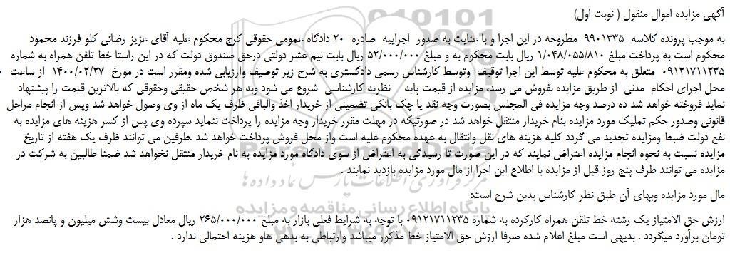 به موجب پرونده کلاسه 9901335 مطروحه در این اجرا و با عنایت به صدور اجراییه صادره 20 دادگاه عمومی حقوقی کرج محکوم علیه آقای عزیز رضائی کلو فرزند محمود محکوم است به پرداخت مبلغ 1/048/055/810 ریال بابت محکوم به و مبلغ 52/000/000 ریال بابت نیم عشر دولتی درحق صندوق دولت که در این راستا خط تلفن همراه به شماره 09121711235 متعلق به محکوم علیه توسط این اجرا توقیف وتوسط کارشناس رسمی دادگستری به شرح زیر توصیف وارزیابی شده ومقرر است در مورخ 1400/02/27 از ساعت 10 الی 11در محل اجرای احکام مدنی از طریق مزایده بفروش می رسد، مزایده از قیمت پایه نظریه کارشناسی شروع می شود وبه هر شخص حقیقی وحقوقی که بالاترین قیمت را پیشنهاد نماید فروخته خواهد شد ده درصد وجه مزایده فی المجلس بصورت وجه نقد یا چک بانکی تضمینی از خریدار اخذ والباقی ظرف یک ماه از وی وصول خواهد شد وپس از انجام مراحل قانونی وصدور حکم تملیک مورد مزایده بنام خریدار منتقل خواهد شد در صورتیکه در مهلت مقرر خریدار وجه مزایده را پرداخت ننماید سپرده وی پس از کسر هزینه های مزایده به نفع دولت ضبط ومزایده تجدید می گردد کلیه هزینه های نقل وانتقال به عهده محکوم علیه است واز محل فروش پرداخت خواهد شد .طرفین می توانند ظرف یک هفته از تاریخ مزایده نسبت به نحوه انجام مزایده اعتراض نمایند که در این صورت تا رسیدگی به اعتراض از سوی دادگاه مورد مزایده به نام خریدار منتقل نخواهد شد ضمنا طالبین به شرکت در مزایده می توانند ظرف پنج روز قبل از مزایده با اطلاع این اجرا از مال مورد مزایده بازدید نمایند .