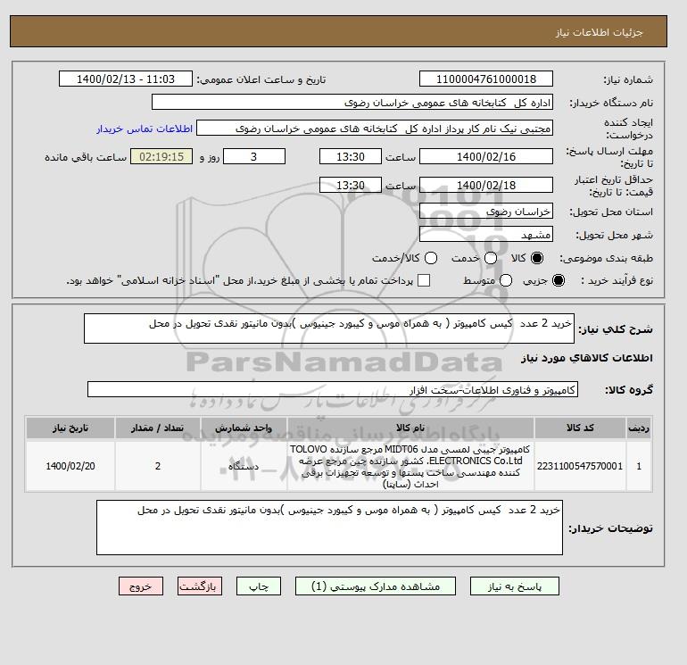 شرح کلی نیاز: خرید 2 عدد کیس کامپیوتر ( به همراه موس و کیبورد جینیوس )بدون مانیتور نقدی تحویل در محل