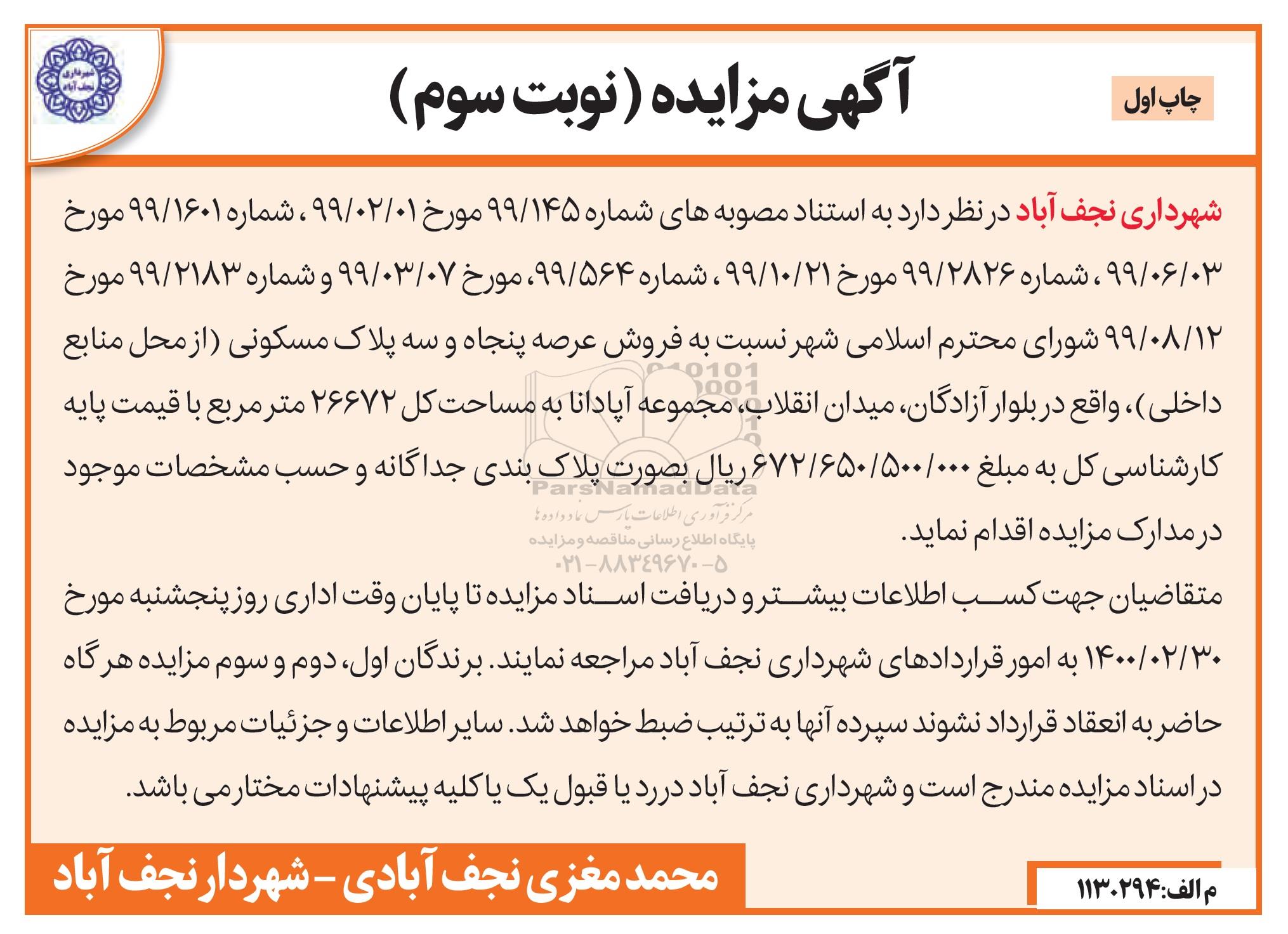 مزایده عمومی مزایده فروش عرصه پنجاه و سه پلاک مسکونی نوبت سوم چاپ اول برگزار میگردد. از کلیه افراد متخصص و شرکت‌های واجد شرایط دعوت به عمل می‌آید تا در این مزایده با کد خبرگزاری پارس نماد : 3377816 شرکت نمایند تاریخ شروع مزایده : 1400/02/13 مهلت شرکت در مزایده: تا پایان روز 1400/02/30 مکان برگزاری اموال واگذاری استان‌های اصفهان و دسته‌بندی‌های مربوط به این حراجی املاک و زمین میباشد.