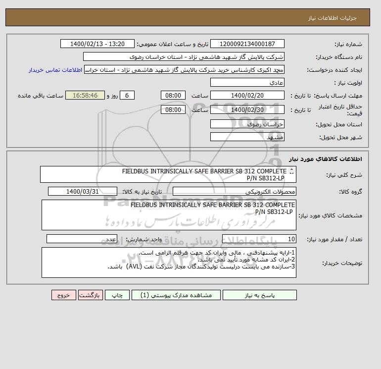نام دستگاه خریدار:شرکت پالایش گاز شهید هاشمی نژاد - استان خراسان رضوی