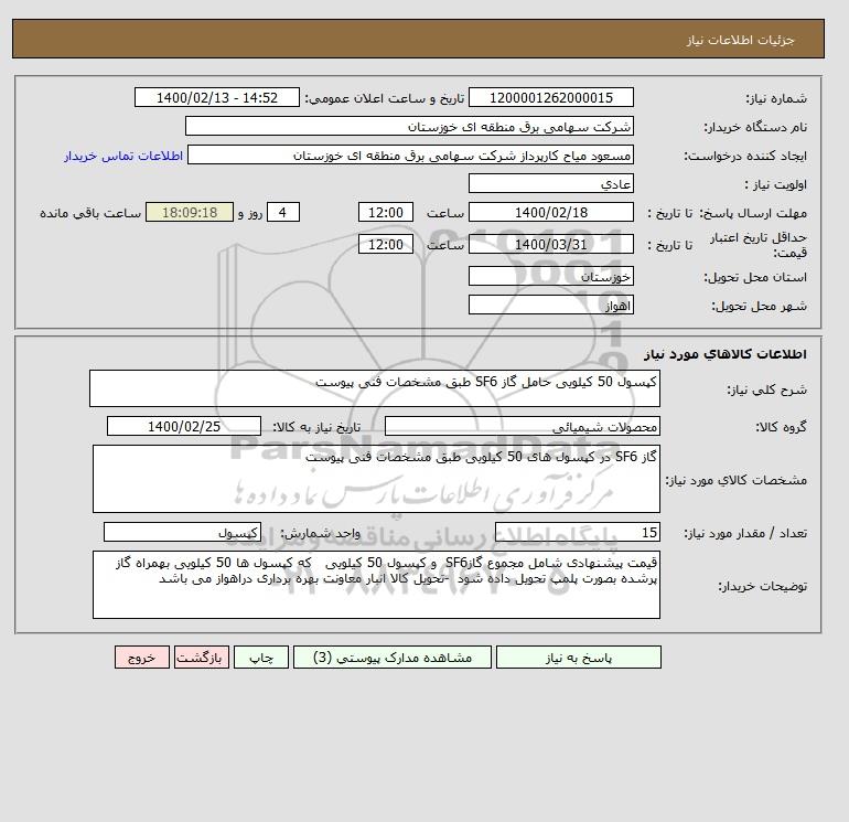 شرح کلی نیاز: کپسول 50 کیلویی حامل گاز SF6 طبق مشخصات فنی پیوست