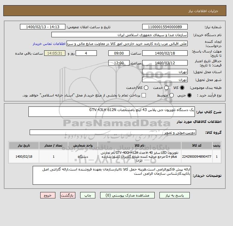 شرح کلی نیاز: یک دستگاه تلویزیون جی پلاس 43 اینچ بامشخصات GTV 43LH 612N