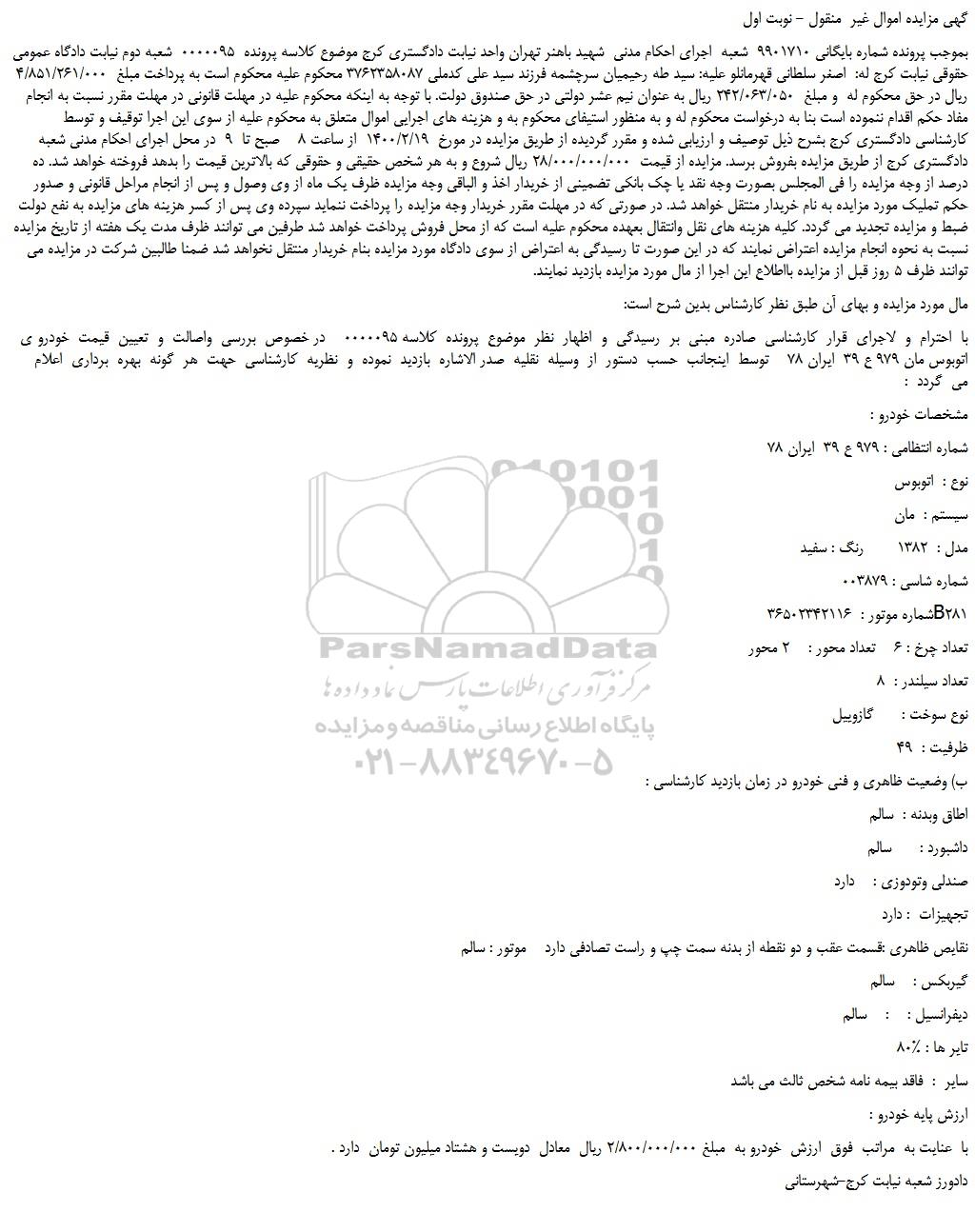 با احترام و لاجرای قرار کارشناسی صادره مبنی بر رسیدگی و اظهار نظر موضوع پرونده کلاسه 0000095 در خصوص بررسی واصالت و تعیین قیمت خودرو ی اتوبوس مان 979 ع 39 ایران 78 توسط اینجانب حسب دستور از وسیله نقلیه صدر الاشاره بازدید نموده و نظریه کارشناسی حهت هر گونه بهره برداری اعلام می گردد :
