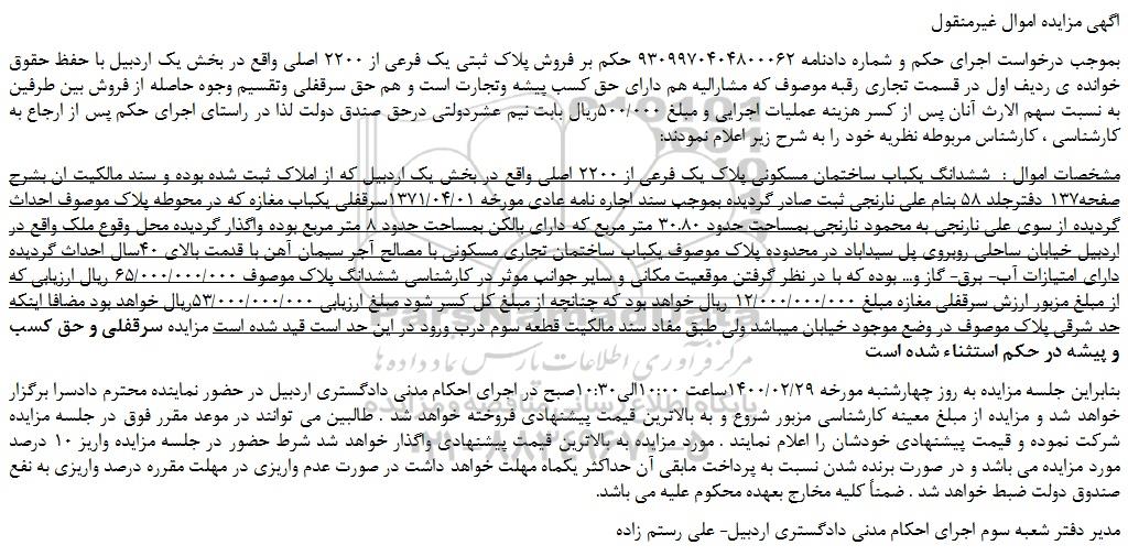 بموجب درخواست اجرای حکم و شماره دادنامه 9309970404800062 حکم بر فروش پلاک ثبتی یک فرعی از 2200 اصلی واقع در بخش یک اردبیل با حفظ حقوق خوانده ی ردیف اول در قسمت تجاری رقبه موصوف که مشارالیه هم دارای حق کسب پیشه وتجارت است و هم حق سرقفلی وتقسیم وجوه حاصله از فروش بین طرفین به نسبت سهم الارث آنان پس از کسر هزینه عملیات اجرایی و مبلغ 500/000ریال بابت نیم عشردولتی درحق صندق دولت لذا در راستای اجرای حکم پس از ارجاع به کارشناسی ، کارشناس مربوطه نظریه خود را به شرح زیر اعلام نمودند: