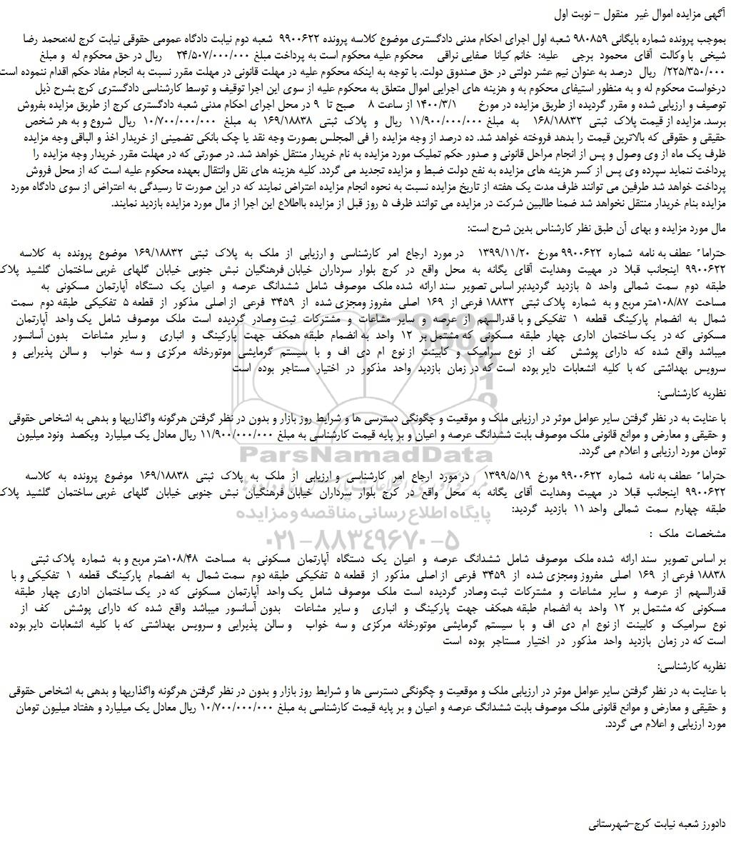 بموجب پرونده شماره بایگانی 980859 شعبه اول اجرای احکام مدنی دادگستری موضوع کلاسه پرونده 9900622 شعبه دوم نیابت دادگاه عمومی حقوقی نیابت کرج له:محمد رضا شیخی با وکالت آقای محمود برجی علیه: خانم کیانا صفایی نراقی محکوم علیه محکوم است به پرداخت مبلغ 24/507/000/000 ریال در حق محکوم له و مبلغ 225/350/000/ ریال درصد به عنوان نیم عشر دولتی در حق صندوق دولت. با توجه به اینکه محکوم علیه در مهلت قانونی در مهلت مقرر نسبت به انجام مفاد حکم اقدام ننموده است بنا به درخواست محکوم له و به منظور استیفای محکوم به و هزینه های اجرایی اموال متعلق به محکوم علیه از سوی این اجرا توقیف و توسط کارشناسی دادگستری کرج بشرح ذیل توصیف و ارزیابی شده و مقرر گردیده از طریق مزایده در مورخ 1400/3/1 از ساعت 8 صبح تا 9 در محل اجرای احکام مدنی شعبه دادگستری کرج از طریق مزایده بفروش برسد. مزایده از قیمت پلاک ثبتی 168/18832 به مبلغ 11/900/000/000 ریال و پلاک ثبتی 169/18838 به مبلغ 10/700/000/000 ریال شروع و به هر شخص حقیقی و حقوقی که بالاترین قیمت را بدهد فروخته خواهد شد. ده درصد از وجه مزایده را فی المجلس بصورت وجه نقد یا چک بانکی تضمینی از خریدار اخذ و الباقی وجه مزایده ظرف یک ماه از وی وصول و پس از انجام مراحل قانونی و صدور حکم تملیک مورد مزایده به نام خریدار منتقل خواهد شد. در صورتی که در مهلت مقرر خریدار وجه مزایده را پرداخت ننماید سپرده وی پس از کسر هزینه های مزایده به نفع دولت ضبط و مزایده تجدید می گردد. کلیه هزینه های نقل وانتقال بعهده محکوم علیه است که از محل فروش پرداخت خواهد شد طرفین می توانند ظرف مدت یک هفته از تاریخ مزایده نسبت به نحوه انجام مزایده اعتراض نمایند که در این صورت تا رسیدگی به اعتراض از سوی دادگاه مورد مزایده بنام خریدار منتقل نخواهد شد ضمنا طالبین شرکت در مزایده می توانند ظرف 5 روز قبل از مزایده بااطلاع این اجرا از مال مورد مزایده بازدید نمایند.