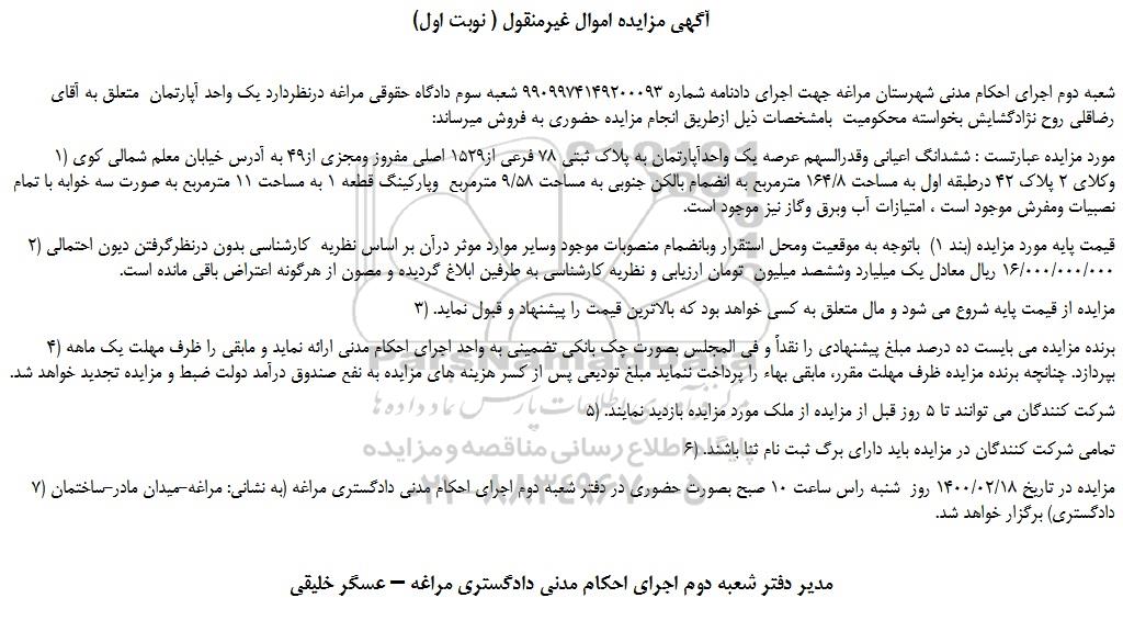 شعبه دوم اجرای احکام مدنی شهرستان مراغه جهت اجرای دادنامه شماره 9909974149200093 شعبه سوم دادگاه حقوقی مراغه درنظردارد یک واحد آپارتمان متعلق به آقای رضاقلی روح نژادگشایش بخواسته محکومیت بامشخصات ذیل ازطریق انجام مزایده حضوری به فروش میرساند: