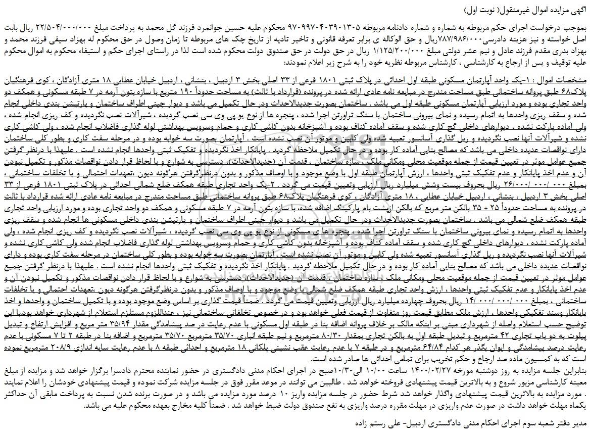مزایده فروش یک واحد آپارتمان مسکونی طبقه اول احداثی در پلاک ثبتی 1801 فرعی از 33 اصلی , مزایده،مزایده فروش یک واحد آپارتمان مسکونی طبقه اول احداثی در پلاک ثبتی 1801 فرعی از 33 اصلی